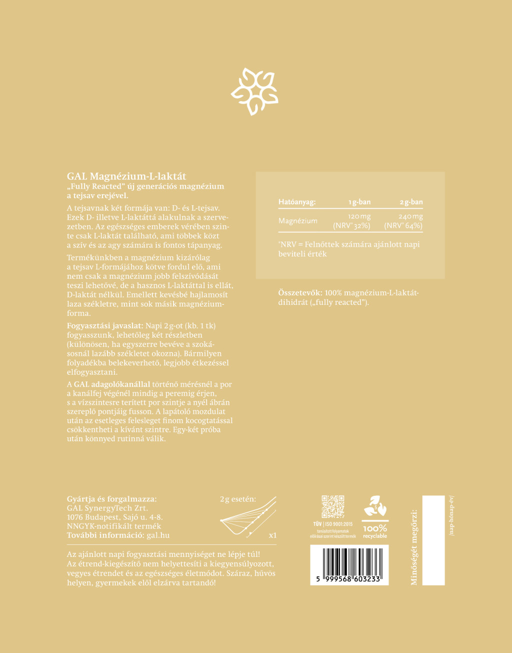 A magnézium-L-laktát 12-13%-a az elemi magnézium, azaz grammonként kb. 125mg jól hasznosuló elemi magnéziummal látja el szervezetünket.