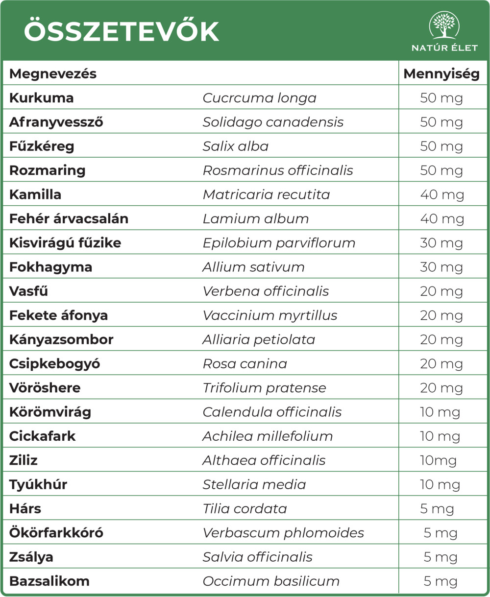 Összesen 21 különböző, gyulladáscsökkentő és nyugtató hatású gyógynövényből áll