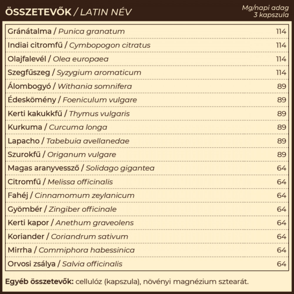 Gránátalma, Indiai citromfű, Olajfalevél, Szegfűszeg, Álombogyó, Édeskömény, Kerti kakukkfű, Kurkuma, Lapacho, Szurokfű, Magas aranyvessző, Citromfű, Fahéj, Gyömbér, Kerti kapor, Koriander, Mirha, Orvosi zsálya
