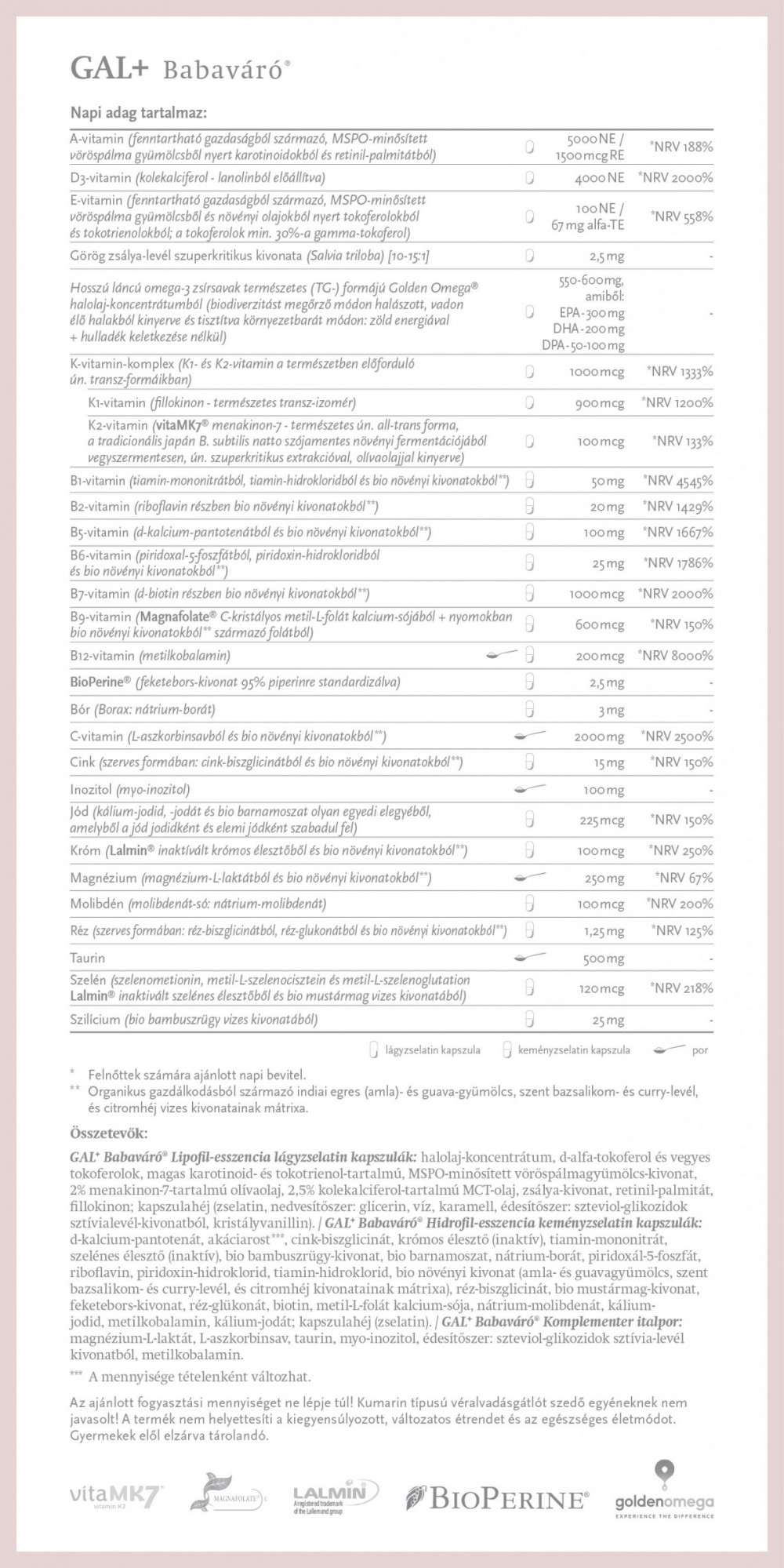 Vasat ne szedjen, csak ha igazoltan vashiányos, de még akkor is érdemes 1-2 hónap GAL+ Babaváró® szedése után újra ellenőrizni, mert nem kizárt, hogy mellette vas nélkül is rendeződik a szintje, főleg, ha rendszeresen fogyaszt mellette májat, és esetleg laktoferrint is. B3-vitamint a termékünk nem tartalmaz, mivel abban szinte mindenki táplálkozása bővelkedik, és a többlet sokaknak előnytelen lenne.