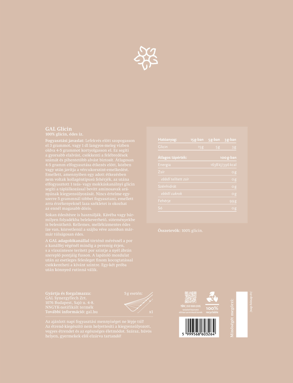 Nincs mellékíze, hőálló, a cukorral nagyjából megegyező édesítő hatása van. A polialkoholokkal (pl.: xilit/nyírfacukor, maltit, eritrit) szemben nem okoz bélrendszeri problémákat senkinél. Nem veri át a szervezetet, mert az édes íze mögött nem üres kalória van, ahogy a legtöbb édesítő esetében, hiszen a glicin fehérje és akként is kezeli szervezetünk. (Az édes íz cukorforrást jelent a szervezetnek és a glicinből szükség esetén a szervezet valóban képes cukrot előállítani, így nem okoz hypoglikémiát.) A túlzott vércukor emelkedést gátló hatása miatt pedig különösen jó – szénhidrátokat amúgy is nagy mennyiségben tartalmazó – sütik és hasonlók édesítésére, hiszen azok hirtelen vércukor növelő hatását kordában tartja.