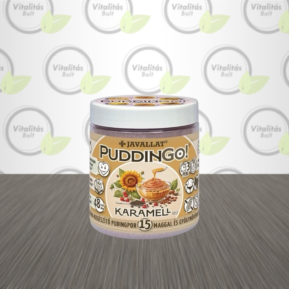15 adag karamell ízű, mag- és gyógynövényalapú, élelmi rostban és fehérjében gazdag, vegán, glutén-, laktóz- és, tejfehérjementes étrend-kiegészítő pudingpor.