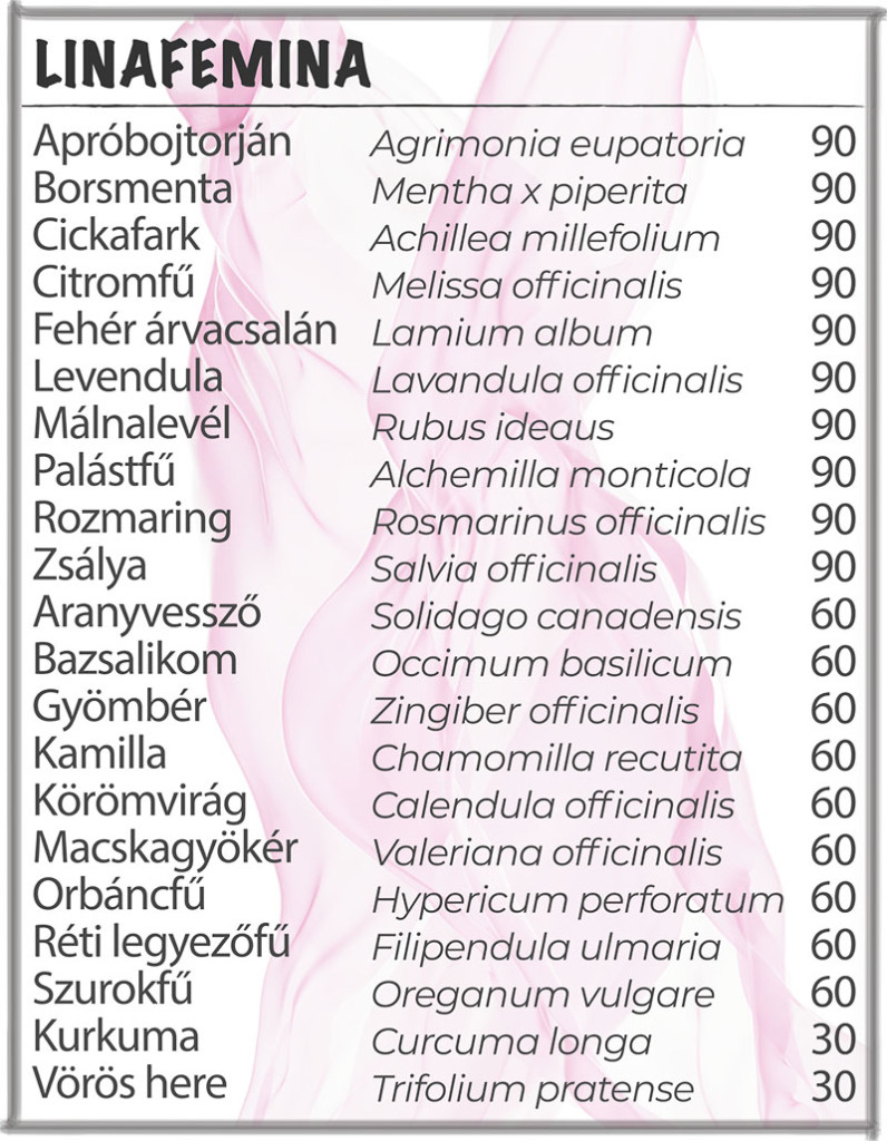 Válassza a természet erejét a Linafemina segítségével, és tegyen lépéseket a teljesebb és problémamentesebb mindennapokért. Bízza magát a gondosan válogatott gyógynövények erejére, és tapasztalja meg a Linafemina áldásos hatásait!